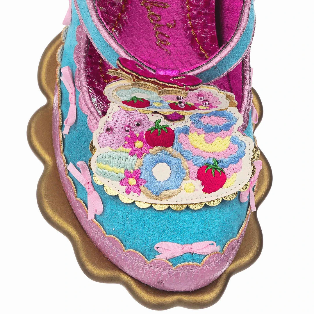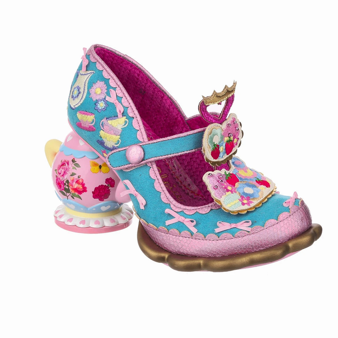 Who’s for a spot of tiffin? Hit the sweet spot in these statement heels! The gorgeous teal upper is embroidered with adorable afternoon tea supplies, and dotted with tiny little bows which lead up to the fabulous decoration on the T-Bar strap! Detailed and gorgeous embellished cakes and treats sit on the front of your foot and look good enough to eat, and if you need something to wash that down then take a look at the heel! Our newest fabulous character heel is shaped like a teapot! Fabulously detailed with a floral design, this pink teapot is spilling out golden tea which forms the sole on these showstoppers!