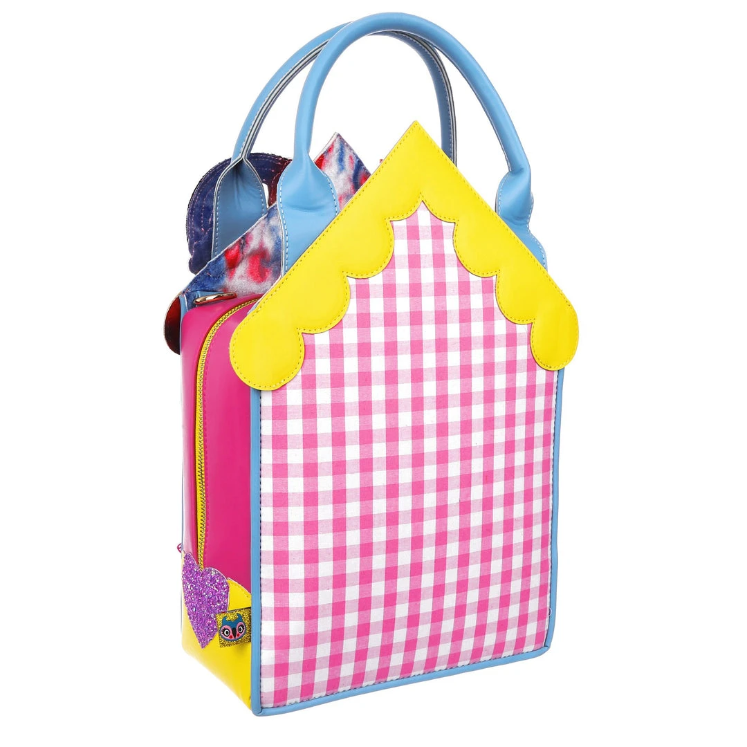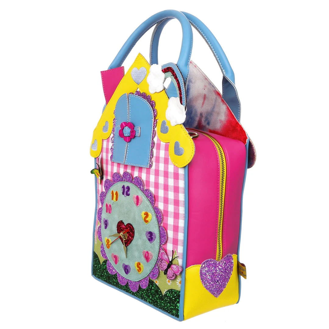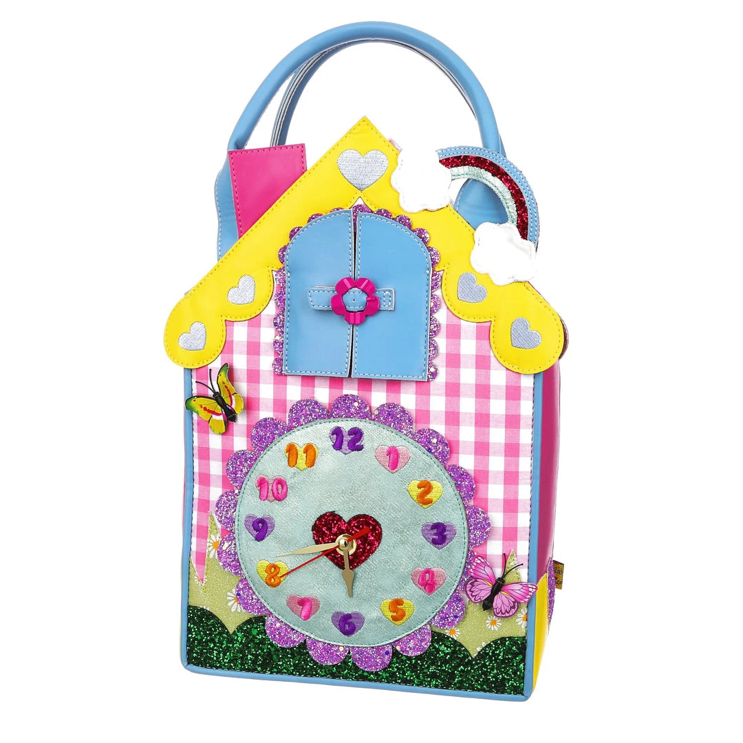 Tick, tick, tock, cuckoo, cuckoo! It’s time you check out this bag! Full of whimsy and wonder this pink gingham carry-all is sure to fill your heart with joy. Styled to look like a cuckoo clock, with a little door that has a bird hiding inside and even movable clock hands – so you can decide if its 5 o’clock somewhere! Comfortable handheld straps and a removable cross body means that there are so many ways to wear this beauty, all fabulous!