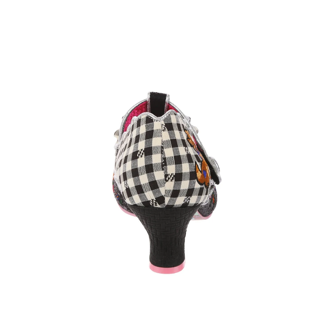 A whimsical wonder, these adorable mid heels are a little breath of fresh air for your wardrobe! A fabulous monochrome colour scheme is embellished with tiny little embroidered posies, which is bordered by the scalloped edges with wrap around the whole shoe! A T-Bar strap leads to the most extravagant black and white gingham bow on the toe, which ties into the white piping and details all around the topline! Of course, we can’t forget to mention the darling little kitty and butterfly embroidered on the side too – simply purr-fect!