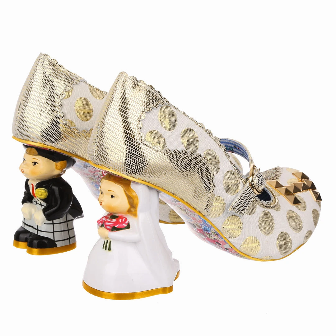 Say I love you with your shoes, literally! Wow guests as you walk down the aisle with bride and groom heels that are ready to say I do! Accented with matching metallic gold dots, edging and Mary-Jane strap, that fastens with a buckle. The ‘I ♡ You’ on the toe is a combination of shiny gold studs, appliquéd gold glitter heart and gold thread embroidery, covering all textural bases! The blushing bride and dapper groom heels really make these shoes stand out from the crowd, both are puckering up for their first kiss as Mr and Mrs. Make sure everyone knows how you feel with these stunning wedding shoes!